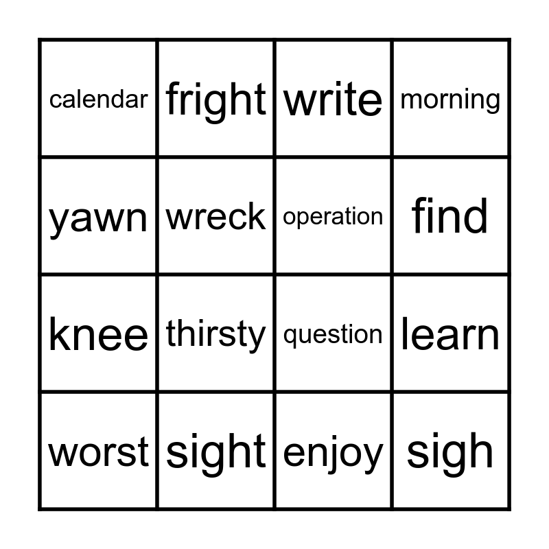 This bingo card has 28 words: knew, know, knee, wrap, wreck, write, fright, sigh, sight, action, question, morning, forget, important, thirsty, adventure, vacation, operation, find, kind, calendar, word, worst, learn, enjoy, ground, yawn and yesterday.