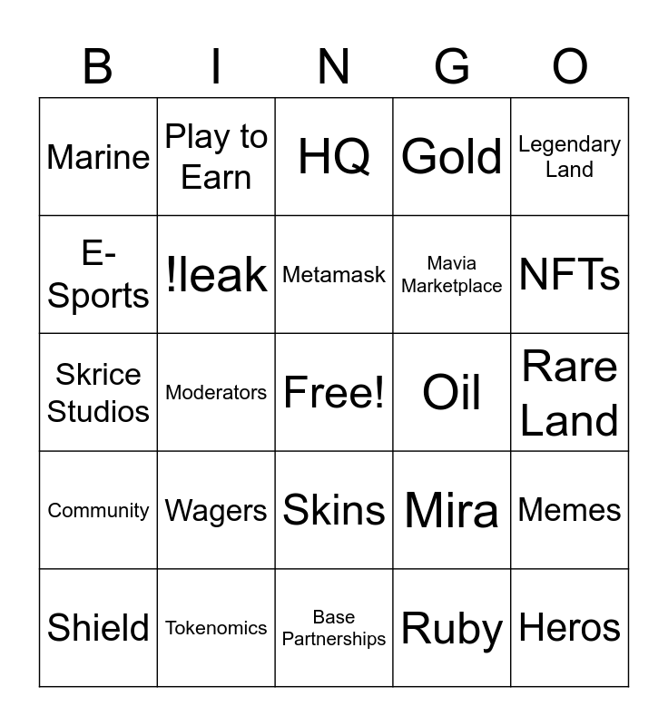 This bingo card has a free space and 45 words: Statues, Heros, Troops, Shield, Arbitrum, Ruby, HQ, Land, Legendary Land, Tokenomics, Gold, Oil, Skins, Wagers, Base Renting, Base Partnerships, Soft-Staking, Skrice Studios, Beta Testing, NFTs, Play to Earn, Gorilla King with Diamond Hands, Markswoman, Marine, Common Land, Rare Land, Land Settler Program, Big Hammer King, Mira, Community, Hero Pets, Memes, Mavians, AMAs, Game Night, Moderators, 3 Stars, Minting, Game Deck, Metamask, E-Sports, Mavia Marketplace, Machinations, !leak and Turn off Dms.