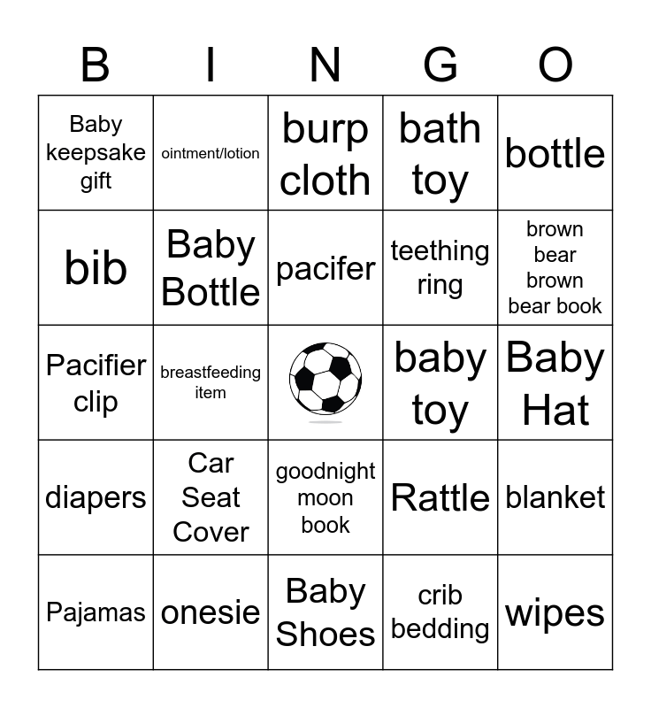 This bingo card has a free space and 26 words: goodnight moon book, crib bedding, pacifer, onesie, bottle, Baby keepsake gift, bib, ointment/lotion, Baby Hat, Rattle, teething ring, Pacifier clip, blanket, Pajamas, breastfeeding item, gift card, bath toy, diapers, burp cloth, wipes, brown bear brown bear book, Baby Shoes, baby toy, Car Seat Cover, Baby Bottle and Basket.