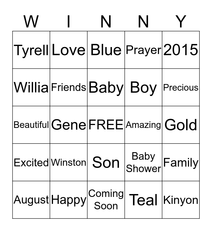 This bingo card has a free space and 24 words: Winston, Happy, Baby, August, 2015, Tyrell, Willia, Love, Amazing, Son, Boy, Beautiful, Baby Shower, Family, Friends, Teal, Gold, Blue, Precious, Gene, Kinyon, Excited, Prayer and Coming Soon.