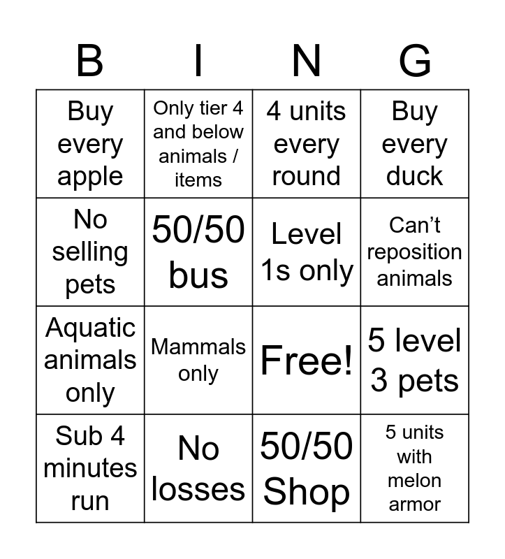 This bingo card has 19 words: Free!, 50/50 Scorpion, 4 units every round, 5 units with melon armor, 5 level 3 pets, No selling pets, 50/50 Shop, Buy every apple, Only tier 4 and below animals / items, Aquatic animals only, Mammals only, 50/50 bus, Level 1s only, No losses, Sub 4 minutes run, 3 winning runs in a row, Buy every duck, Can’t reposition animals and Pill a hedgehog.