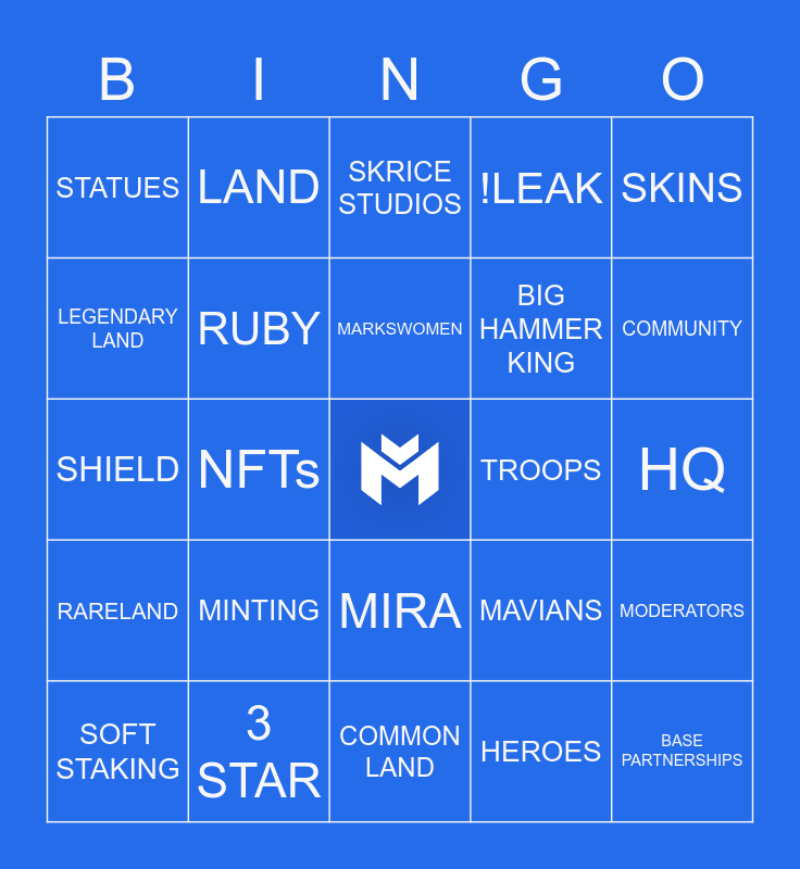 This bingo card has a free space and 24 words: SOFT STAKING, MINTING, MARKSWOMEN, HEROES, SKINS, STATUES, LAND, SKRICE STUDIOS, TROOPS, HQ, SHIELD, RUBY, MAVIANS, MODERATORS, LEGENDARY LAND, 3 STAR, COMMON LAND, !LEAK, COMMUNITY, RARELAND, NFTs, MIRA, BIG HAMMER KING and BASE PARTNERSHIPS.
