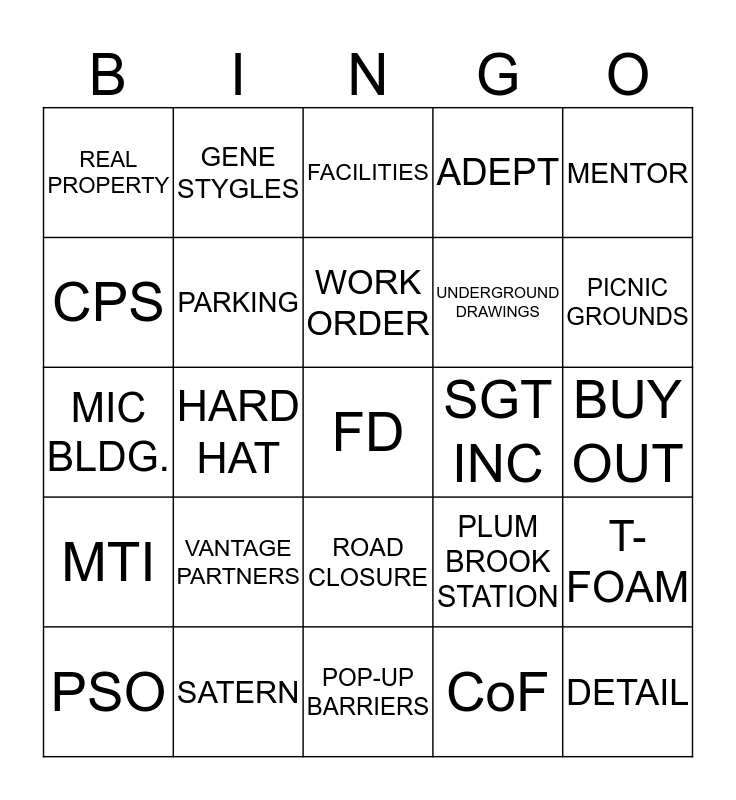 This bingo card has a free space and 42 words: AS-BUILTS, WORK ORDER, BLUEPRINT, VANTAGE PARTNERS, CoF, T-FOAM, DETAIL, SUBSTATION, FACILITIES, ROAD CLOSURE, BUY OUT, PICNIC GROUNDS, HARD HAT, MENTOR, MAIN GATE, PLUM BROOK STATION, SAFETY, MIC BLDG., INFO EXCHANGE, GENE STYGLES, CPS, BLDG. 21, SPECSINTAC, REAL PROPERTY, BUILDING MGR, COOLING TOWER, UNDERGROUND DRAWINGS, COTR, CUBE FARM, HVAC, MAXIMO, MTI, PARKING, POP-UP BARRIERS, PROJECT MGT, PSO, SATERN, SGT INC, SPACE MGT, CONSTRUCTION, ADEPT and ALL HANDS SURVEY.