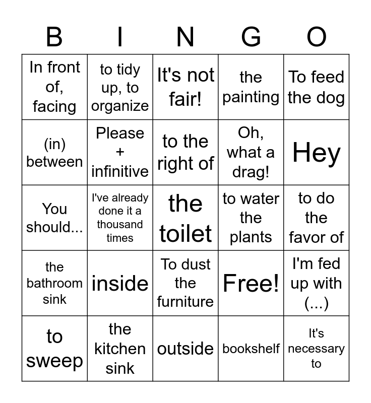 This bingo card has 25 words: inside, outside, to the right of, to sweep, To feed the dog, In front of, facing, (in) between, to tidy up, to organize, to water the plants, To dust the furniture, Oh, what a drag!, You should..., Free!, I'm fed up with (...), Please + infinitive, It's necessary to, to do the favor of, It's not fair!, Hey, I've already done it a thousand times, the toilet, the kitchen sink, the bathroom sink, the painting and bookshelf.