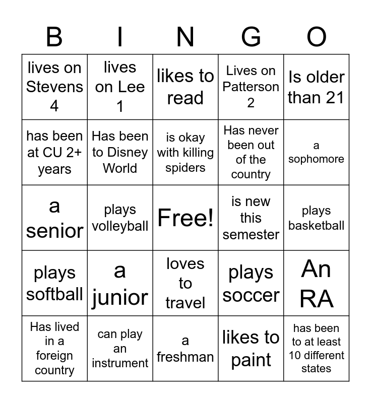 This bingo card has a free space and 29 words: Has lived in a foreign country, Has more than 2 siblings, plays volleyball, can speak fluently in another language, lives on Stevens 4, likes to read, Has been to Disney World, a junior, is new this semester, can play an instrument, plays basketball, has been to at least 10 different states, a freshman, likes to paint, a sophomore, have/ has had bangs, loves to travel, plays softball, Is older than 21, a senior, plays soccer, lives on Patterson 3, Has never been out of the country, has been at CU 2+ years, Lives on Patterson 2, lives on Lee 1, An RA, is okay with killing spiders and hates spiders.
