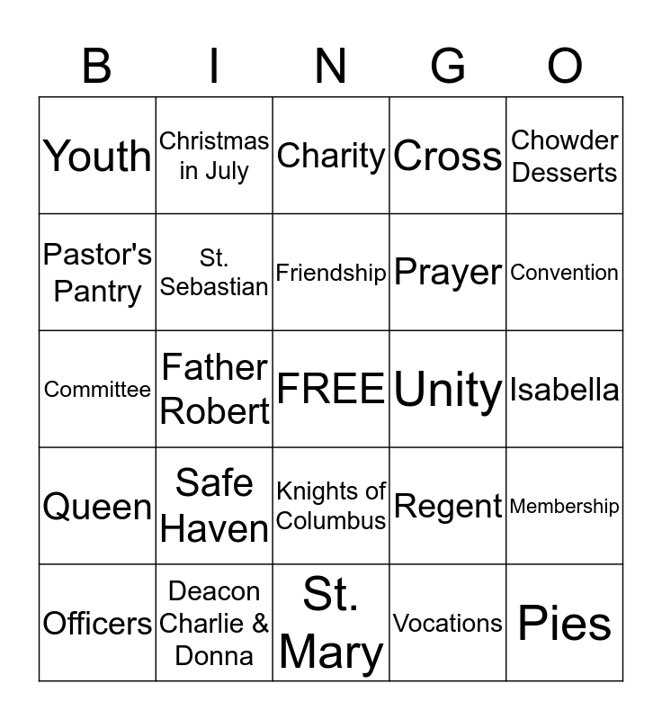 This bingo card has a free space and 24 words: Safe Haven, Deacon Charlie & Donna, Friendship, Officers, Chowder Desserts, Youth, Pastor's Pantry, Christmas in July, Unity, Knights of Columbus, Prayer, Committee, Regent, Membership, St. Sebastian, Vocations, Isabella, Charity, Convention, Father Robert, Pies, Queen, Cross and St. Mary.