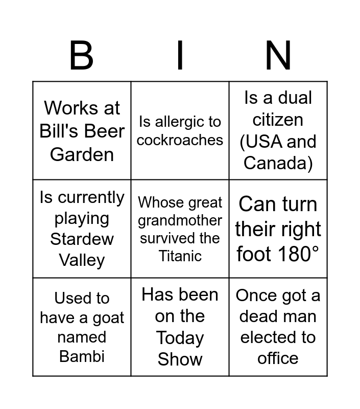 This bingo card has 41 words: Free!, Was in a movie, Coaches youth basketball, Used to have a goat named Bambi, Was dunked on by an NBA player, Has recorded a CD, Has been on the Today Show, Was in the 2010 Super Bowl, Whose great grandmother survived the Titanic, Was in the marching band at Auburn, Co-hosts a Michigan Football podcast, Is currently playing Stardew Valley, Law is their third career, Babysat David Beckham's kids twice, Is really good at spotting celebs, Loves sci-fi books, Has a fraternal twin, Works at Bill's Beer Garden, Has never had Taco Bell, Is a dual citizen (USA and Canada), Went to preschool in Thailand, Used to play in a Nirvana cover band, Minored in music in undergrad, Once got a dead man elected to office, Is attempting to visit all state parks in Michigan, Is baking their way through a whole cookbook, Has three passports, Had the headless horseman as their high school mascot, Has been to every continent, Plays pro frisbee, Played bassoon in a statewide band in middle school, Is allergic to cockroaches, Worked at a winery as a wine tasting guide, Is double jointed, Love to make National Parks art, Can turn their right foot 180°, Speaks Polish, Has run two marathons, Has hiked the seven tallest presidential mountains in New Hampshire, Is pretty good at making guac because their parents own avocado groves and Was raised in a village.