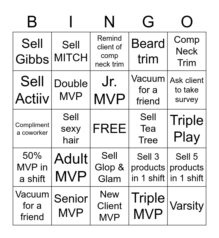 This bingo card has a free space and 24 words: Adult MVP, Senior MVP, Jr. MVP, Vacuum for a friend, Comp Neck Trim, Sell Gibbs, Sell Actiiv, Sell MITCH, Sell Tea Tree, Sell Glop & Glam, Vacuum for a friend, Compliment a coworker, Sell 3 products in 1 shift, Sell 5 products in 1 shift, Double MVP, Triple MVP, Triple Play, Remind client of comp neck trim, Ask client to take survey, Sell sexy hair, Varsity, 50% MVP in a shift, Beard trim and New Client MVP.