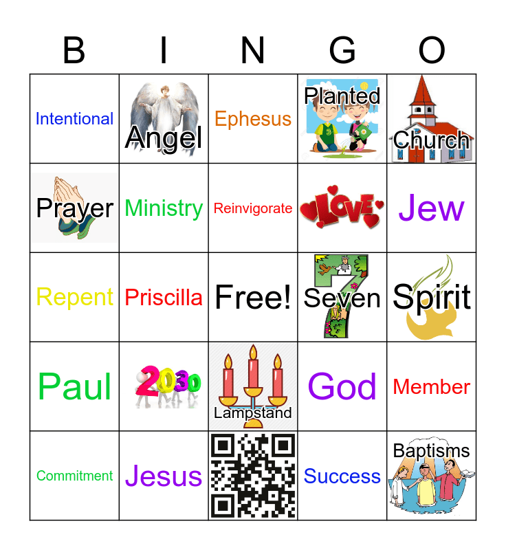 This bingo card has 11 images, a free space and 21 words: Jesus, Reinvigorate, Commitment, Church, Intentional, Prayer, Angel, Seven, Lampstand, Repent, God, Member, Ministry, Success, Spirit, Ephesus, Jew, Priscilla, Baptisms, Paul and Planted.