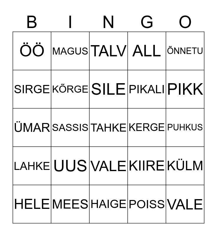 This bingo card has 25 words: UUS, HAIGE, SILE, HELE, ÕNNETU, ÖÖ, SIRGE, MAGUS, KERGE, VALE, PIKALI, ÜMAR, KIIRE, KÜLM, KÕRGE, VALE, PUHKUS, TALV, PIKK, SASSIS, TAHKE, MEES, LAHKE, ALL and POISS.