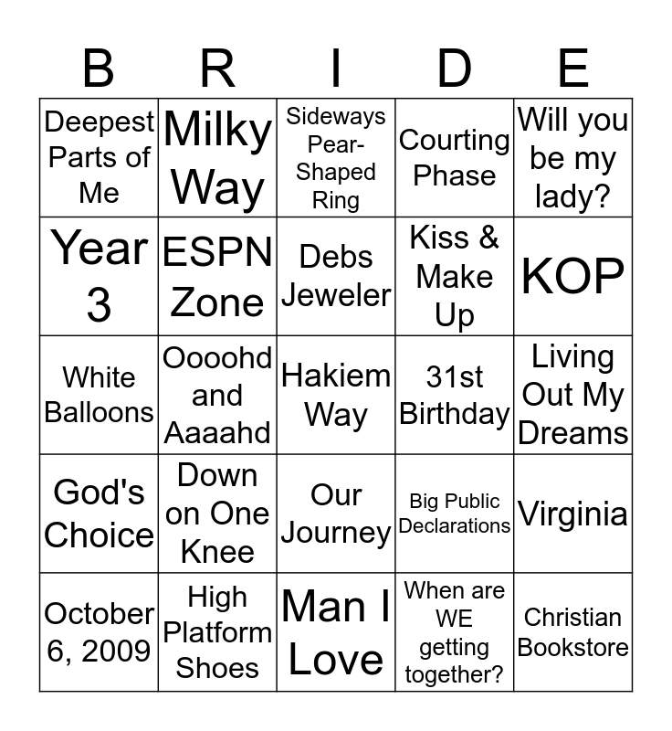 This bingo card has 34 words: Christian Bookstore, When are WE getting together?, Reef, Penn's Landing, God's Choice, ESPN Zone, Will you be my lady?, October 6, 2009, Milky Way, Rittenhouse Park, Debs Jeweler, Sideways Pear-Shaped Ring, You must be Hakiem, Candace's boyfriend., 4th Year Anniversary, 31st Birthday, KOP, High Platform Shoes, White Balloons, Down on One Knee, Big Public Declarations, Our Journey, My Authenticity, Deepest Parts of Me, Living Out My Dreams, Man I Love, Hakiem Way, Courting Phase, Answer to Prayer, Kiss & Make Up, Year 3, iPod Nano, Oooohd and Aaaahd, Virginia and Thee Ring, MY Ring.