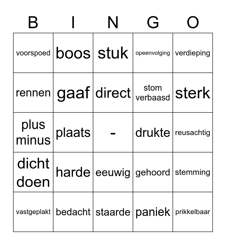 This bingo card has a free space and 24 words: harde, bedacht, direct, vastgeplakt, verdieping, voorspoed, rennen, boos, drukte, eeuwig, stom verbaasd, plus minus, gehoord, stemming, gaaf, paniek, reusachtig, stuk, sterk, plaats, prikkelbaar, dicht doen, opeenvolging and staarde.