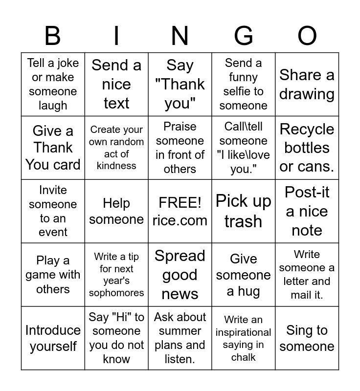This bingo card has a free space and 24 words: Write a tip for next year's sophomores, Say "Hi" to someone you do not know, Praise someone in front of others, Introduce yourself, Share a drawing, Tell a joke or make someone laugh, Give a Thank You card, Send a nice text, Pick up trash, Spread good news, Call\tell someone "I like\love you.", Invite someone to an event, Give someone a hug, Write someone a letter and mail it., Create your own random act of kindness, Write an inspirational saying in chalk, Post-it a nice note, Say "Thank you", Recycle bottles or cans., Help someone, Sing to someone, Play a game with others, Send a funny selfie to someone and Ask about summer plans and listen..