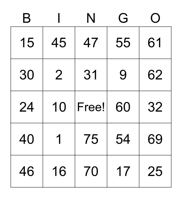 This bingo card has a free space and 24 words: 1, 16, 31, 46, 61, 15, 30, 45, 60, 75, 9, 24, 54, 69, 2, 17, 32, 47, 62, 10, 25, 40, 55 and 70.