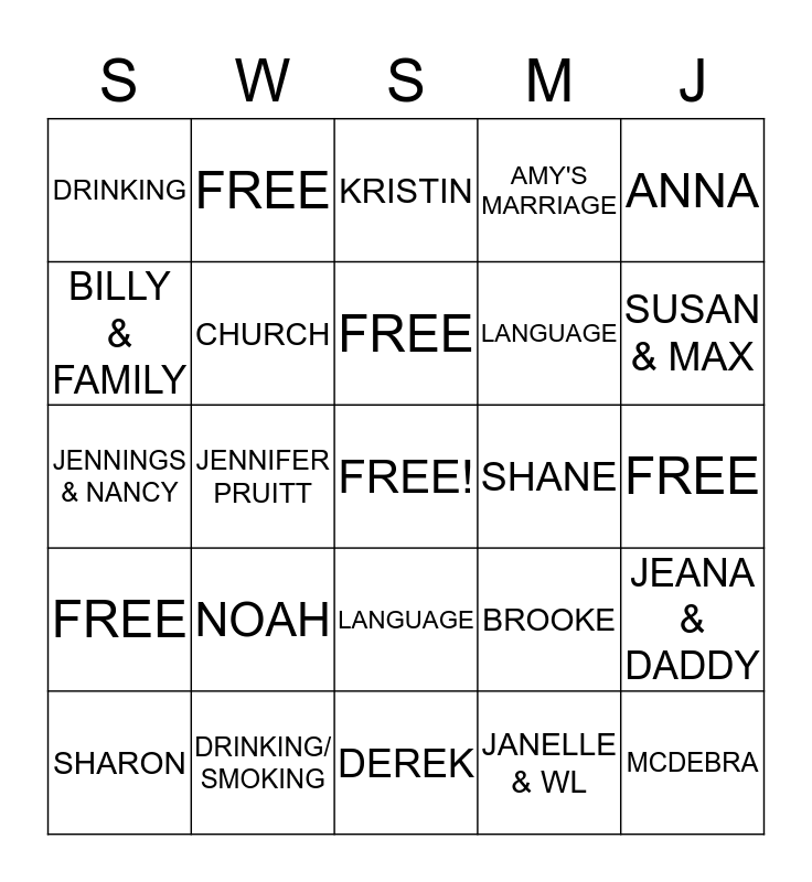 This bingo card has a free space and 24 words: NOAH, DRINKING/ SMOKING, FREE, SHARON, ANNA, DRINKING, BILLY & FAMILY, FREE, SHANE, LANGUAGE, LANGUAGE, JENNINGS & NANCY, BROOKE, JEANA & DADDY, CHURCH, JANELLE & WL, FREE, KRISTIN, SUSAN & MAX, JENNIFER PRUITT, MCDEBRA, FREE, AMY'S MARRIAGE and DEREK.