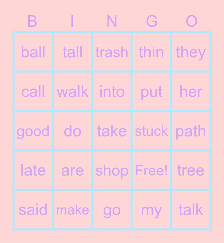 This bingo card has 25 words: are, go, into, said, they, ball, call, tall, stuck, shop, put, good, Free!, tree, walk, talk, path, trash, her, do, take, make, late, thin and my.