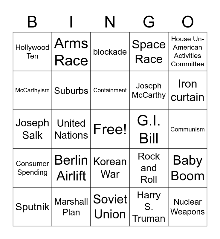 This bingo card has a free space and 24 words: Berlin Airlift, Marshall Plan, Containment, Sputnik, House Un-American Activities Committee, Hollywood Ten, McCarthyism, Arms Race, G.I. Bill, Korean War, Joseph McCarthy, Joseph Salk, Rock and Roll, Baby Boom, Suburbs, Harry S. Truman, Communism, blockade, Iron curtain, United Nations, Nuclear Weapons, Consumer Spending, Space Race and Soviet Union.