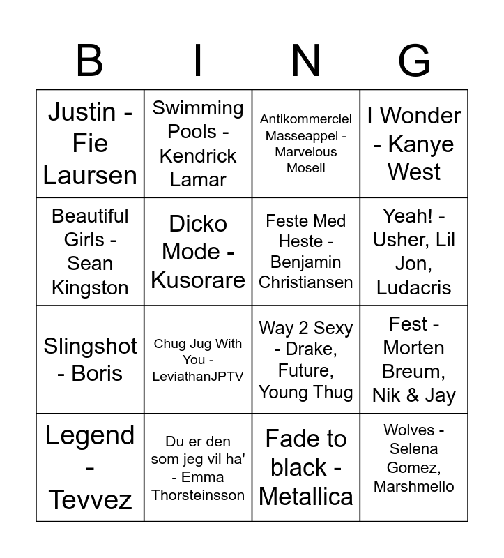 This bingo card has 16 words: Du er den som jeg vil ha' - Emma Thorsteinsson, Fest - Morten Breum, Nik & Jay, Antikommerciel Masseappel - Marvelous Mosell, Justin - Fie Laursen, Slingshot - Boris, Swimming Pools - Kendrick Lamar, Way 2 Sexy - Drake, Future, Young Thug, Fade to black - Metallica, Beautiful Girls - Sean Kingston, Dicko Mode - Kusorare, Legend - Tevvez, I Wonder - Kanye West, Chug Jug With You - LeviathanJPTV, Yeah! - Usher, Lil Jon, Ludacris, Feste Med Heste - Benjamin Christiansen and Wolves - Selena Gomez, Marshmello.