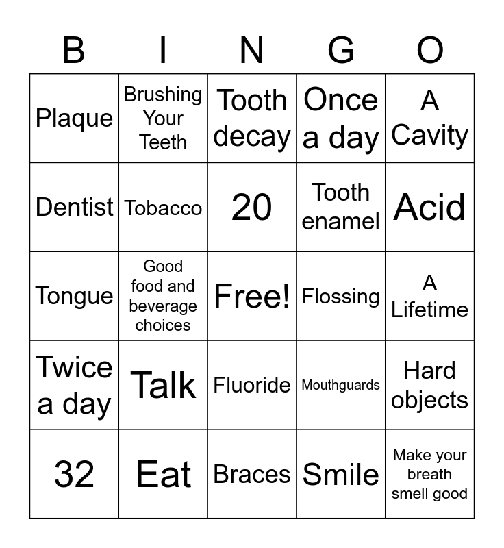 This bingo card has a free space and 24 words: Talk, Eat, 20, 32, A Cavity, Plaque, Dentist, Brushing Your Teeth, Flossing, Fluoride, Tooth enamel, Tongue, Mouthguards, Hard objects, Tobacco, Smile, A Lifetime, Tooth decay, Acid, Good food and beverage choices, Make your breath smell good, Twice a day, Once a day and Braces.
