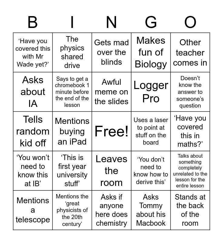 This bingo card has a free space and 30 words: Mentions the ‘great physicists of the 20th century’, Absurdly expensive practical, Mentions buying an iPad, You should be doing the Paper 1s on the classroom, ‘Have you covered this with Mr Wade yet?’, Gets mad over the blinds, Says to get a chromebook 1 minute before the end of the lesson, Leaves the room, Uses a laser to point at stuff on the board, Asks if anyone here does chemistry, ‘Have you covered this in maths?’, Stands at the back of the room, Asks Tommy about his Macbook, Answers a phone call, Doesn’t know the answer to someone’s question, Asks if something is in the formula booklet, ‘You don’t need to know how to derive this’, ‘You won’t need to know this at IB’, ‘This is first year university stuff’, Other teacher comes in, Tells random kid off, Thinks all the school should use iPads, The physics shared drive, Logger Pro, Asks about IA, Makes fun of Biology, Talks about something completely unrelated to the lesson for the entire lesson, Mentions a telescope, Awful meme on the slides and Pulls up YouTube video.
