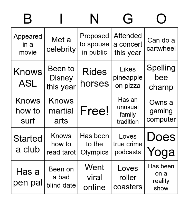 This bingo card has a free space and 24 words: Knows how to read tarot, Been on a bad blind date, Rides horses, Has a pen pal, Can do a cartwheel, Appeared in a movie, Knows ASL, Met a celebrity, Has an unusual family tradition, Has been to the Olympics, Likes pineapple on pizza, Knows how to surf, Loves true crime podcasts, Does Yoga, Been to Disney this year, Loves roller coasters, Owns a gaming computer, Proposed to spouse in public, Spelling bee champ, Knows martial arts, Has been on a reality show, Started a club, Attended a concert this year and Went viral online.