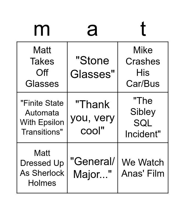 This bingo card has 30 words: "General/ Private/ Major...", "I went to Cambridge", "Barely/Hardly Even Know Her", "Bitcoin", Matt Takes Off Glasses, Mike Crashes His Car/Bus, Matt Dressed Up As Sherlock Holmes, Matt Shows Symptoms Of Gaming, Matt Wears Duck Floatie, Matt Puts It There, Matt & Chris In The Same Room, Abstraction Alert, "James Can't Spell", "Coding at 6:30", Matt Flexes, "Sticking To The Script", Matt In A Hat, "Among Us", "You've Been Vector'd", "Thank you, very cool", Passive Revision Demon, "Mike Is Lily", "Stone Glasses", We Watch Anas' Film, "The Sibley SQL Incident", "Finite State Automata With Epsilon Transitions", Matt Joins Applause, "Harry Potter", "General/ Major..." and Chuck Norris Meme.