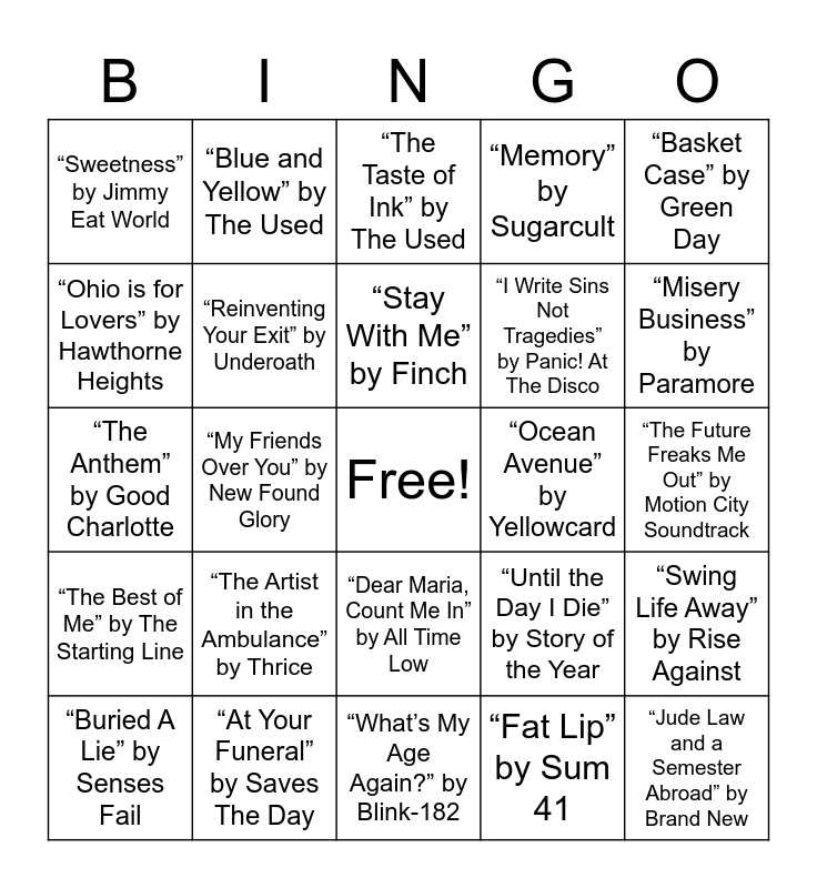 This bingo card has a free space and 29 words: “Buried A Lie” by Senses Fail, “I’m Not Okay, I Promise” by My Chemical Romance, “My Friends Over You” by New Found Glory, “Cute Without the E” by Taking Back Sunday, “Sweetness” by Jimmy Eat World, “The Taste of Ink” by The Used, “Reinventing Your Exit” by Underoath, “The Artist in the Ambulance” by Thrice, “Ocean Avenue” by Yellowcard, “At Your Funeral” by Saves The Day, “The Future Freaks Me Out” by Motion City Soundtrack, “Jude Law and a Semester Abroad” by Brand New, “What’s My Age Again?” by Blink-182, “Fat Lip” by Sum 41, “Misery Business” by Paramore, “Move Along” by The All-American Rejects, “Dear Maria, Count Me In” by All Time Low, “The Best of Me” by The Starting Line, “Basket Case” by Green Day, “The Anthem” by Good Charlotte, “Until the Day I Die” by Story of the Year, “Alive With The Glory of Love” by Say Anything, “I Write Sins Not Tragedies” by Panic! At The Disco, “Ohio is for Lovers” by Hawthorne Heights, “Memory” by Sugarcult, “Blue and Yellow” by The Used, “Swing Life Away” by Rise Against, “Stay With Me” by Finch and “Thrash Unreal” by Against Me!.