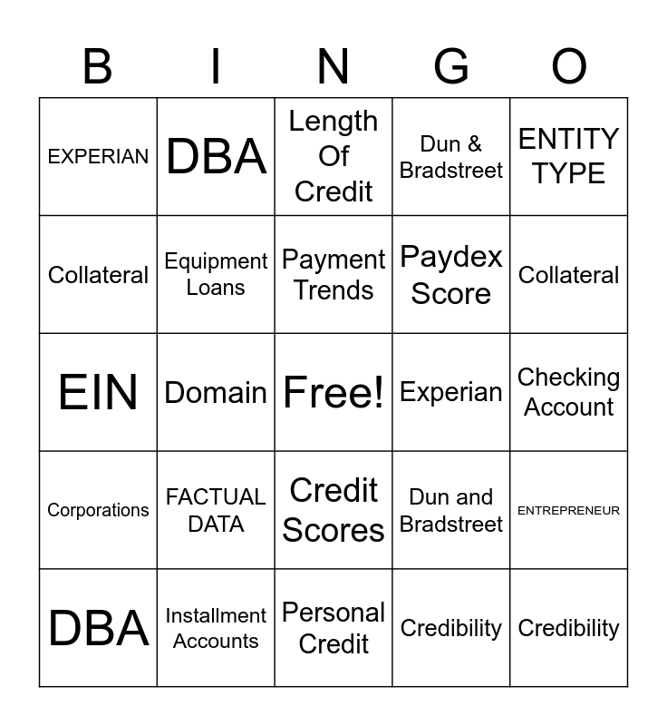 This bingo card has a free space and 67 words: EIN, ChexSystems, Business Credit, ENTREPRENEUR, Credit Reports, Capital, DBA, Credit Mix, Payment Trends, Credit Cards, Credit Scores, Better Day Consulting, Checking Account, ENTITY TYPE, EQUIPMENT LOANS, Collateral, Domain, EXPERIAN, Credit Risk Score, Paydex Score, FACTUAL DATA, Corporations, Dun & Bradstreet, Credibility, Business Credit, Capital, Checking Account, ChexSystems, Collateral, Corporations, Credibility, Credit Cards, Credit Mix, Credit Reports, Credit Scores, DBA, Domain, Dun and Bradstreet, EIN, Entity Type, Entrepreneurs, Equipment Loans, Experian, Factual Data, FICO, Foundation, Funding, Installment Accounts, Interest Rates, IRS, Length Of Credit, Lines Of Credit, LLC, Microloans, NAICS/SIC, Personal Credit, Personal Guarantee, Physical Address, Registered Agent, SBA Loans, Seafax, Secretary of State, Start Up Loans, Paydex Score, Payment Trends, Credit Risk Score and Better Day Consulting.