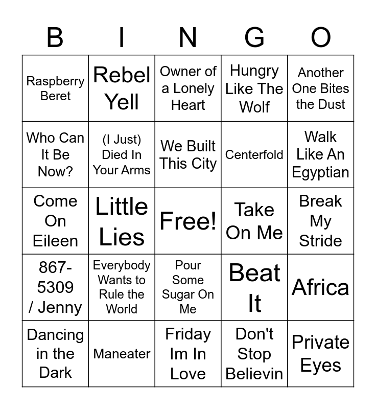 This bingo card has a free space and 24 words: Everybody Wants to Rule the World, Maneater, We Built This City, Dancing in the Dark, Another One Bites the Dust, Raspberry Beret, Who Can It Be Now?, Rebel Yell, Take On Me, Pour Some Sugar On Me, Centerfold, Come On Eileen, Beat It, Africa, (I Just) Died In Your Arms, Don't Stop Believin, Break My Stride, Owner of a Lonely Heart, Walk Like An Egyptian, Little Lies, Private Eyes, 867-5309 / Jenny, Hungry Like The Wolf and Friday Im In Love.