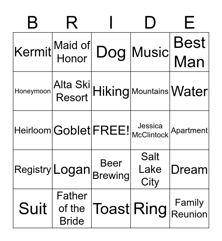This bingo card has a free space and 24 words: Logan, Father of the Bride, Hiking, Suit, Best Man, Kermit, Honeymoon, Maid of Honor, Jessica McClintock, Beer Brewing, Mountains, Heirloom, Salt Lake City, Dream, Alta Ski Resort, Ring, Apartment, Dog, Water, Goblet, Family Reunion, Registry, Music and Toast.