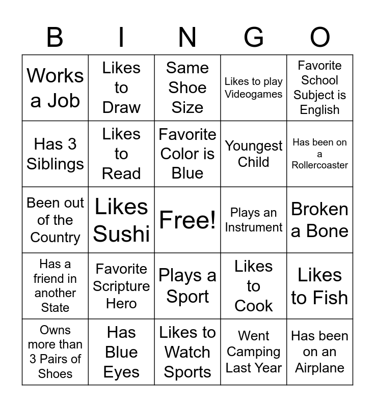 This bingo card has a free space and 25 words: Favorite Scripture Hero, Likes to Watch Sports, Favorite Color is Blue, Owns more than 3 Pairs of Shoes, Favorite School Subject is English, Works a Job, Has 3 Siblings, Likes to Draw, Plays an Instrument, Plays a Sport, Youngest Child, Been out of the Country, Likes to Cook, Likes to Fish, Likes to Read, Left Handed, Broken a Bone, Same Shoe Size, Has been on a Rollercoaster, Likes Sushi, Has been on an Airplane, Has Blue Eyes, Has a friend in another State, Likes to play Videogames and Went Camping Last Year.