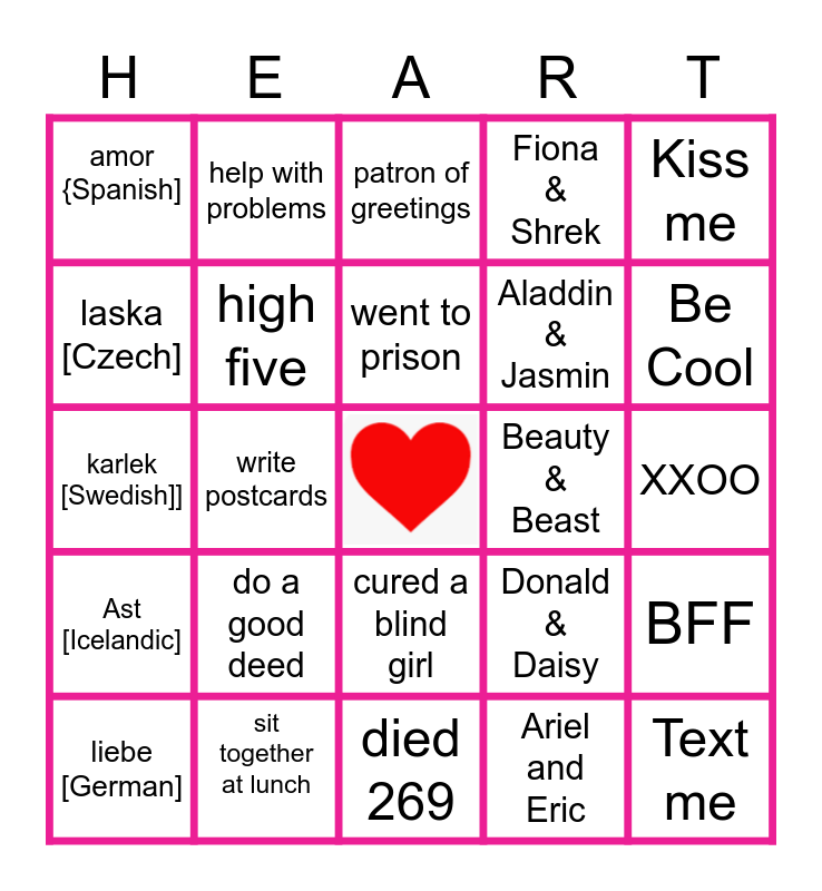 This bingo card has 1 images, a free space and 43 words: do a good deed, patron of love, Ariel and Eric, Soul Mate, love [English], high five, feast is 2/14, Fiona & Shrek, Text me, amor {Spanish], sit together at lunch, Donald & Daisy, XXOO, amore [Italian], help with big feelings, died 269, Beauty & Beast, Will you be mine?, karlek [Swedish]], help with problems, cured a blind girl, Mickey & Minnie, Kiss me, pag-ibig [Tagalog], follow up, went to prison, Mr. & Mrs. Claus, BFF, liebe [German], tell jokes, patron of greetings, Mr & Mrs. Incredible, Love Bug, Ast [Icelandic], go places together, bishop of Terni, Italy, Cinderella & Prince Charming, Be Cool, laska [Czech], write postcards, patron of marriage, Aladdin & Jasmin and Cutie Pie.