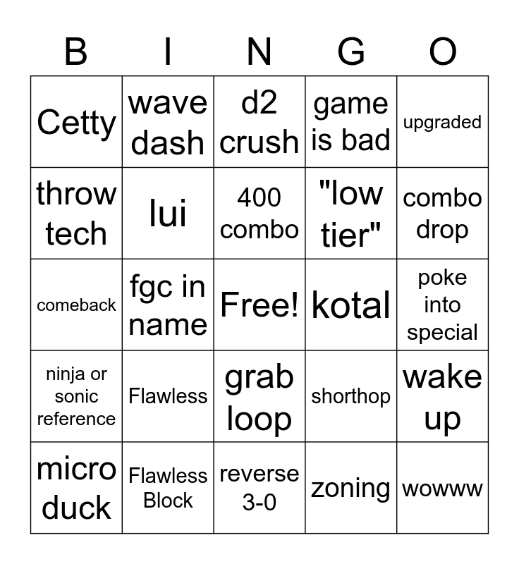 This bingo card has a free space and 24 words: Flawless, Flawless Block, 400 combo, micro duck, upgraded, Cetty, throw tech, wave dash, kotal, grab loop, "low tier", comeback, shorthop, wake up, lui, zoning, poke into special, d2 crush, combo drop, fgc in name, wowww, ninja or sonic reference, game is bad and reverse 3-0.