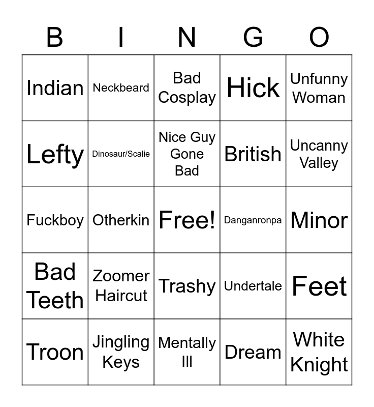 This bingo card has a free space and 34 words: Pacifier, Dream, Fursuit, Obese, Bad Teeth, Dinosaur/Scalie, Unfunny Woman, Troon, Neckbeard, Potential Pedophile, Nice Guy Gone Bad, Bad Cosplay, FNAF, Goth, Danganronpa, Uncanny Valley, Jingling Keys, Fuckboy, Zoomer Haircut, Undertale, Trashy, Squalor, Indian, Minor, Mentally Ill, White Knight, Hick, Balding, British, Lefty, MAGA, Otherkin, Feet and Booba.