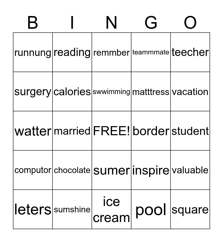 This bingo card has a free space and 24 words: chocolate, sumshine, swwimming, leters, teecher, runnung, surgery, reading, border, sumer, matttress, watter, inspire, valuable, calories, pool, student, remmber, vacation, married, square, computor, teammmate and ice cream.