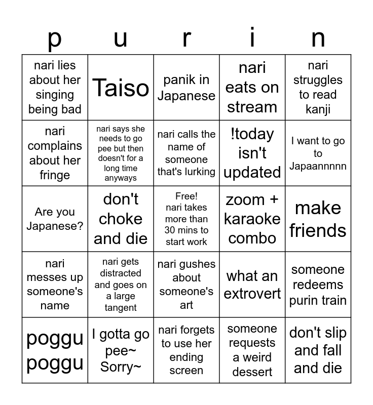 This bingo card has a free space and 28 words: someone redeems purin train, nari sings along to the bgm, !today isn't updated, someone requests a weird dessert, nari complains about her fringe, panik in Japanese, Taiso, nari messes up someone's name, zoom + karaoke combo, poggu poggu, Are you Japanese?, nari eats on stream, I gotta go pee~ Sorry~, nari forgets to use her ending screen, I want to go to Japaannnnn, smh, nari gets distracted and goes on a large tangent, nari says she needs to go pee but then doesn't for a long time anyways, nari calls the name of someone that's lurking, nari gushes about someone's art, nari lies about her singing being bad, nari hides behind her plushie out of embarassment, don't slip and fall and die, don't choke and die, make friends, what an extrovert, nari struggles to read kanji and nari says she's bad at introductions.