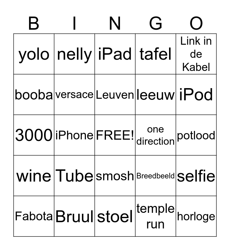 This bingo card has a free space and 24 words: Tube, Bruul, Leuven, Fabota, Link in de Kabel, yolo, booba, nelly, one direction, smosh, leeuw, 3000, Breedbeeld, selfie, versace, temple run, potlood, iPad, iPod, iPhone, horloge, wine, tafel and stoel.