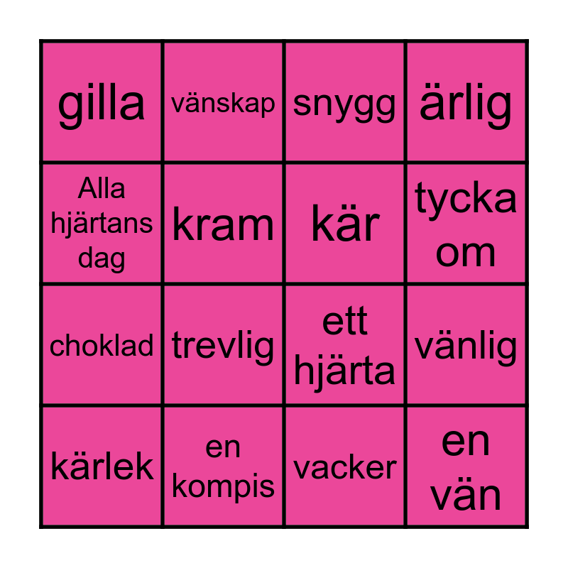 This bingo card has 16 words: en kompis, vänlig, snygg, gilla, choklad, vänskap, ett hjärta, vacker, Alla hjärtans dag, kram, kärlek, ärlig, trevlig, tycka om, kär and en vän.