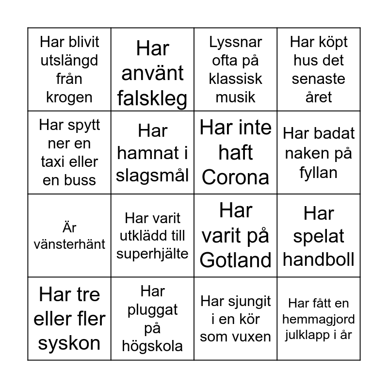 This bingo card has 25 words: Har samma ögonfärg som du, Har sjukanmält sig för bakfylla, Har badat naken på fyllan, Har somnat på en fest, Har spytt ner en taxi eller en buss, Har blivit utslängd från krogen, Har hamnat i slagsmål, Har använt falskleg, Har pluggat på högskola, Har varit utanför Europa, Är vänsterhänt, Har varit på Gotland, Har bott i Norrland, Har ljugit om sin ålder, Har inte haft Corona, Har haft tandställning, Har sjungit i en kör som vuxen, Lyssnar ofta på klassisk musik, Har varit utklädd till superhjälte, Har spelat handboll, Har tre eller fler syskon, Har svårt att skilja på höger och vänster, Har fått en hemmagjord julklapp i år, Har köpt hus det senaste året and Har vrit på inspelning av ett TV-program.