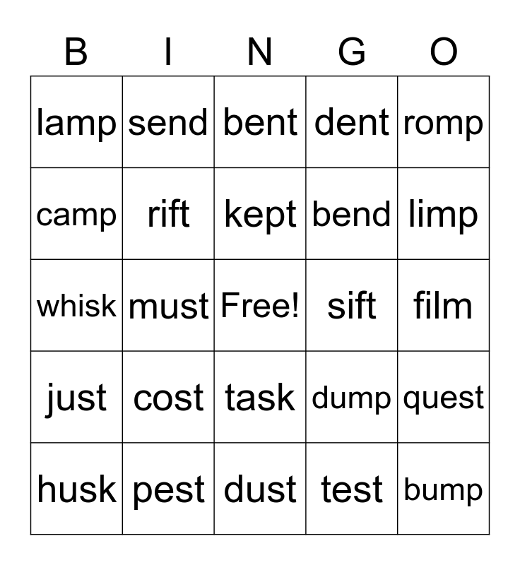 This bingo card has a free space and 24 words: cost, pest, kept, husk, romp, lamp, camp, send, sift, task, bend, whisk, dump, quest, rift, test, film, bent, limp, must, bump, just, dent and dust.