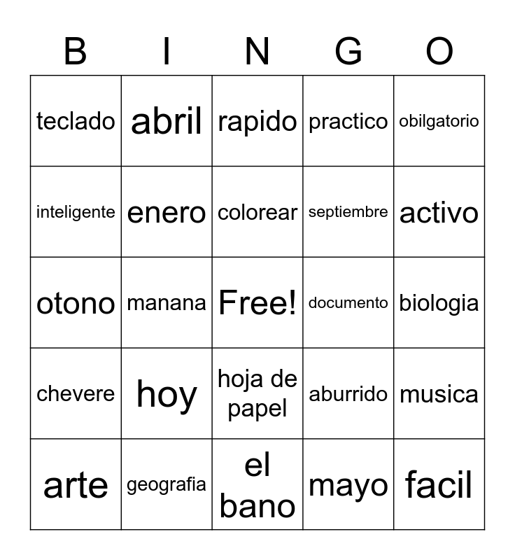 This bingo card has a free space and 24 words: hoy, geografia, colorear, arte, obilgatorio, teclado, inteligente, abril, documento, hoja de papel, septiembre, otono, aburrido, musica, enero, mayo, biologia, rapido, activo, manana, facil, chevere, practico and el bano.