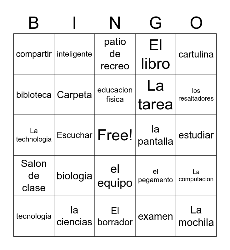 This bingo card has a free space and 24 words: biologia, la ciencias, educacion fisica, tecnologia, cartulina, compartir, bibloteca, inteligente, la pantalla, el equipo, La tarea, La technologia, el pegamento, La computacion, Carpeta, examen, estudiar, patio de recreo, los resaltadores, Escuchar, La mochila, Salon de clase, El libro and El borrador.