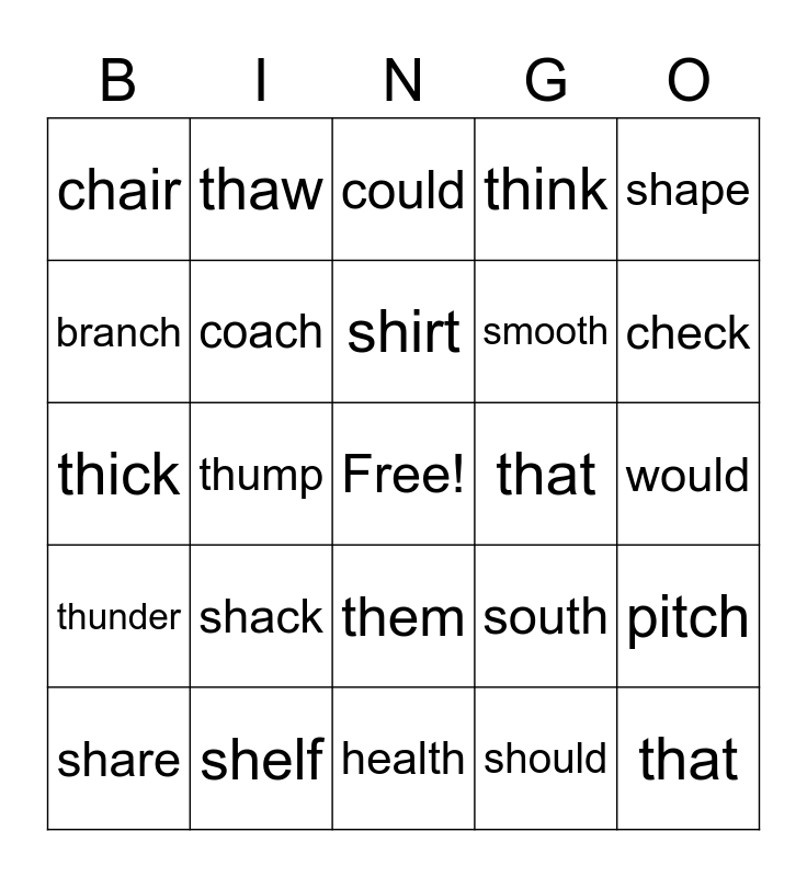 This bingo card has a free space and 24 words: shack, shelf, shirt, share, shape, chair, branch, thaw, that, them, smooth, thick, south, pitch, coach, should, would, could, check, thump, that, thunder, think and health.