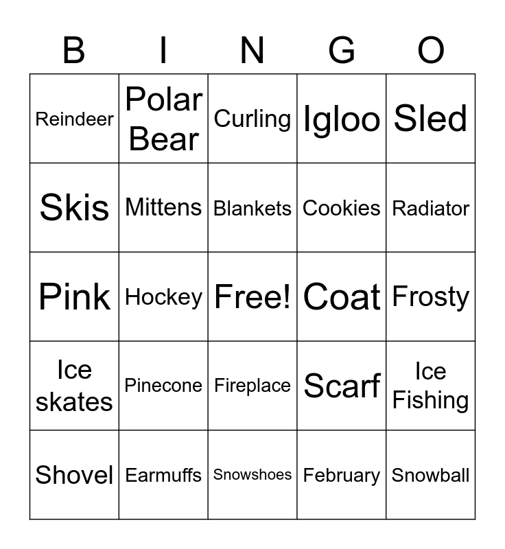 This bingo card has a free space and 39 words: Olaf, Flamingo, Hats, Mittens, Shovel, Fireplace, Blankets, Jack Frost, Sled, Ice skates, Hockey, Igloo, Snowball, Frosty, Coat, Pinecone, Anna, Reindeer, Soup, Scarf, Skis, Snowshoes, Cookies, Radiator, Gloves, Sweater, Slippers, Socks, Snowboard, Polar Bear, Boots, Zero Degrees, Curling, Earmuffs, February, Gingerbread, Ice Fishing, Pink and Library.