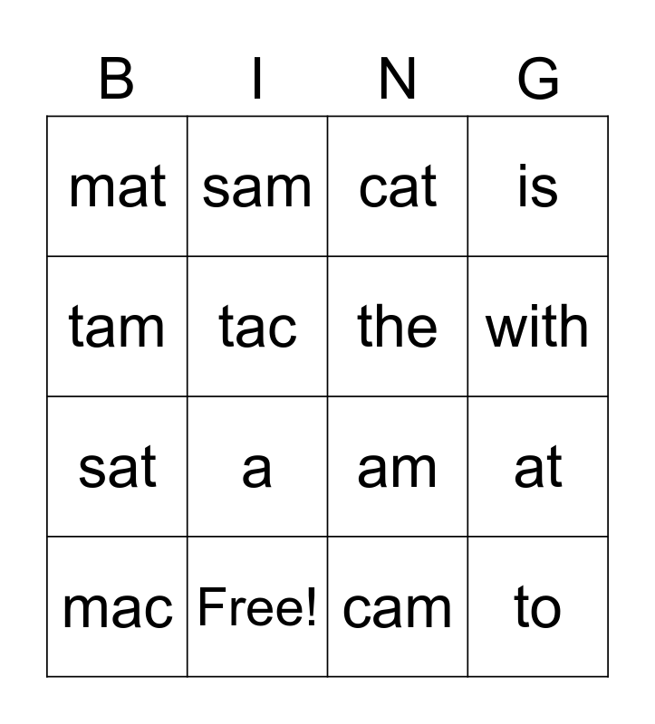 This bingo card has 16 words: Free!, at, cat, mat, sat, sam, am, cam, tam, tac, mac, is, a, with, the and to.