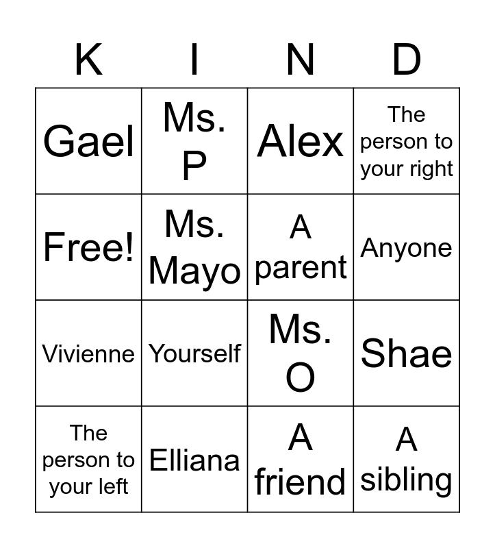 This bingo card has 16 words: Elliana, Shae, Alex, Gael, Vivienne, Ms. P, Ms. O, A friend, Free!, Ms. Mayo, The person to your left, The person to your right, Yourself, Anyone, A parent and A sibling.