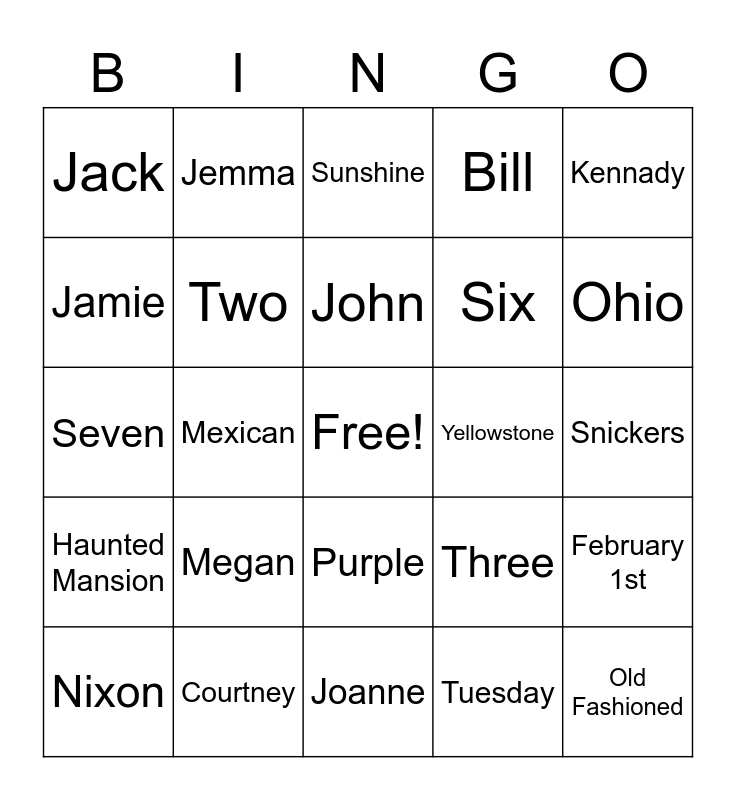 This bingo card has a free space and 24 words: Megan, Courtney, John, Nixon, Kennady, Jack, Jamie, Jemma, Yellowstone, Purple, Six, Seven, Three, February 1st, Two, Tuesday, Snickers, Sunshine, Ohio, Mexican, Old Fashioned, Haunted Mansion, Bill and Joanne.
