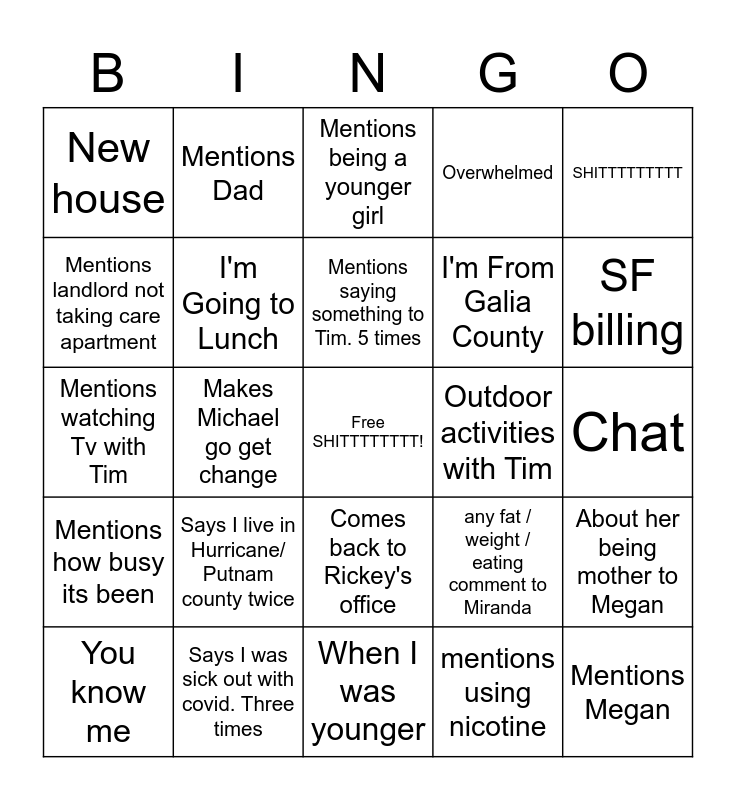 This bingo card has a free space and 24 words: Says I live in Hurricane/ Putnam county twice, Says I was sick out with covid. Three times, Mentions saying something to Tim. 5 times, You know me, SHITTTTTTTTT, New house, Mentions landlord not taking care apartment, Mentions Dad, Outdoor activities with Tim, Comes back to Rickey's office, I'm From Galia County, Mentions watching Tv with Tim, any fat / weight / eating comment to Miranda, About her being mother to Megan, I'm Going to Lunch, mentions using nicotine, Chat, Mentions being a younger girl, SF billing, Makes Michael go get change, Mentions Megan, Mentions how busy its been, Overwhelmed and When I was younger.