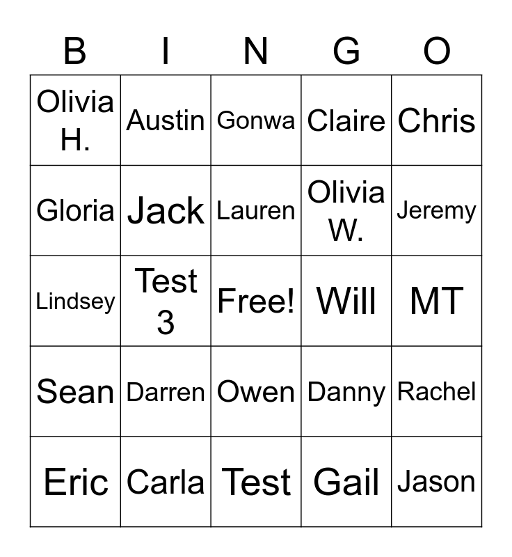 This bingo card has a free space and 31 words: Test, Test2, Test 3, Kristin, Olivia H., Gonwa, Jack, Danny, Will, Gail, MT, Jason, Nick, Brandon, Jeremy, Jim E., Rachel, Darren, Sean, Owen, Chris, Jim K., Eric, Austin, Olivia W., Gloria, Claire, Lindsey, Carla, Lauren and Zach.