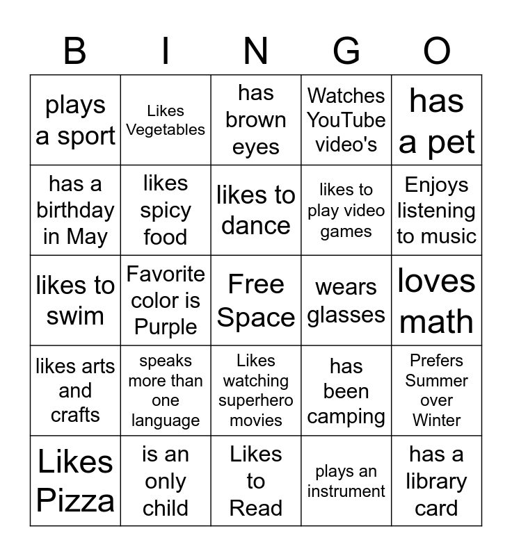 This bingo card has a free space and 24 words: speaks more than one language, is an only child, likes to dance, Likes Pizza, has a pet, plays a sport, has a birthday in May, Likes Vegetables, wears glasses, Likes watching superhero movies, likes to play video games, likes to swim, has been camping, Prefers Summer over Winter, likes spicy food, plays an instrument, loves math, has brown eyes, Enjoys listening to music, Favorite color is Purple, has a library card, likes arts and crafts, Watches YouTube video's and Likes to Read.